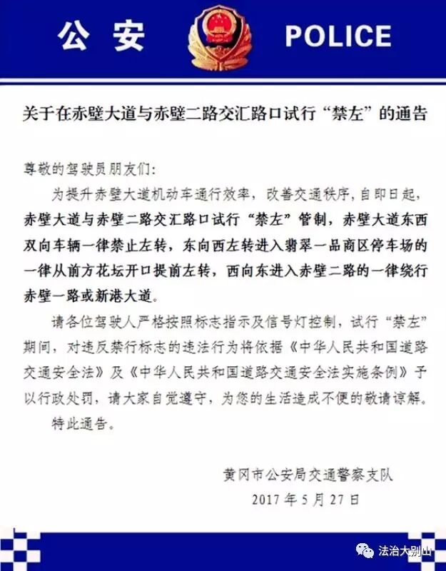 为提升赤壁大道机动车通行效率,改善交通秩序,自即日起,赤壁大道与赤壁二路交汇路口试行“禁左”管制,赤壁大道东西双向车辆一律禁止左转,东向西左转进入翡翠一品商区停车场的一律从前方花坛开口提前左转,西向东进入赤壁二路的一律绕行赤壁一路或新港大道。请各位驾驶人严格按照标志指示及信号灯控制,试行“禁左”期间,对违反禁行标志的违法行为将依据《中华人民共和国道路交通安全法》及《中华人民共和国道路交通安全法实施条例》予以行政处罚,请大家自觉遵守,给您的生活造成不便敬请谅解。