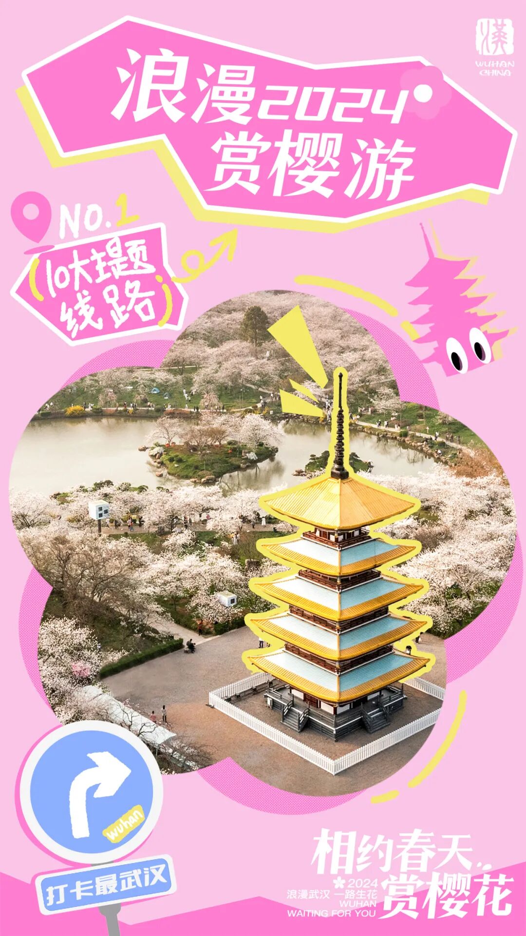 「武汉大学」坐拥樱花城堡、樱花大道;「东湖樱花园」是世界三大赏樱胜地之一;「晴川假日酒店」的樱花与江景同框……