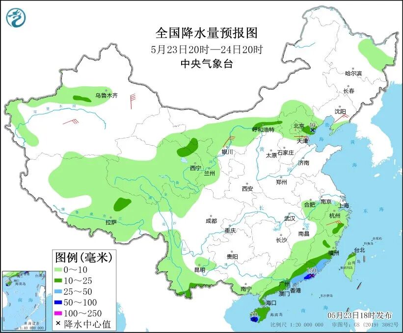 23日20时至24日20时,新疆南疆盆地、西藏东部、甘肃中部、内蒙古中部、河北东北部、云南南部、广东东部和南部沿海、福建东南部、浙江东部、海南岛、台湾岛等地部分地区有中到大雨,其中,广东东南部沿海、海南岛西南部等地局地有暴雨或大暴雨。