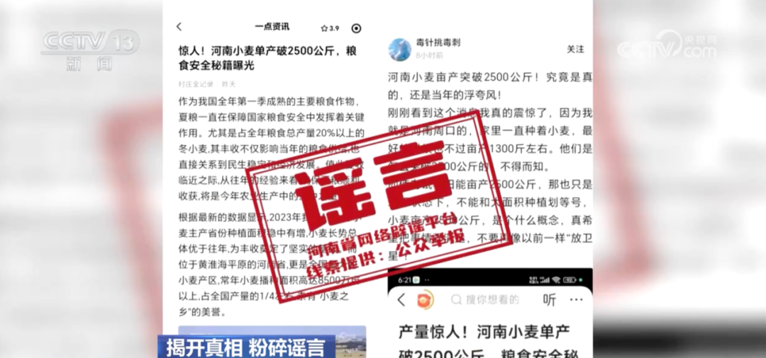 5月21日,网络博主“大时代故事”发文称,“惊人!河南小麦单产破2500公斤,粮食安全秘籍曝光”。随后,网络平台多个账号转发、评论相关信息。