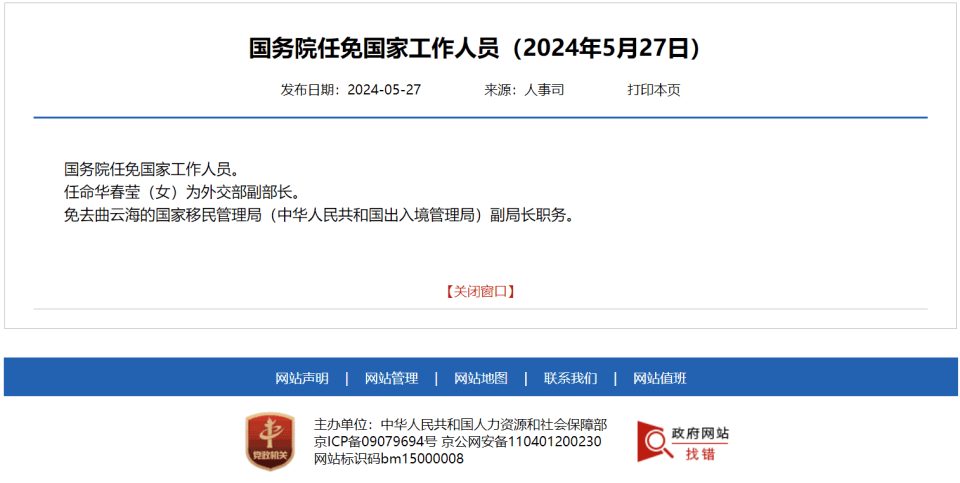 华春莹任外交部副部长 2024-05-27 15:00 0 据人力资源和社会保障部网站27日消息,国务院任免国家工作人员。任命华春莹(女)为外交部副部长。免去曲云海的国家移民管理局(中华人民共和国出入境管理局)副局长职务。 华春莹(图源:外交部网站) 人力资源和社会保障部网站截图 来源|观察者网