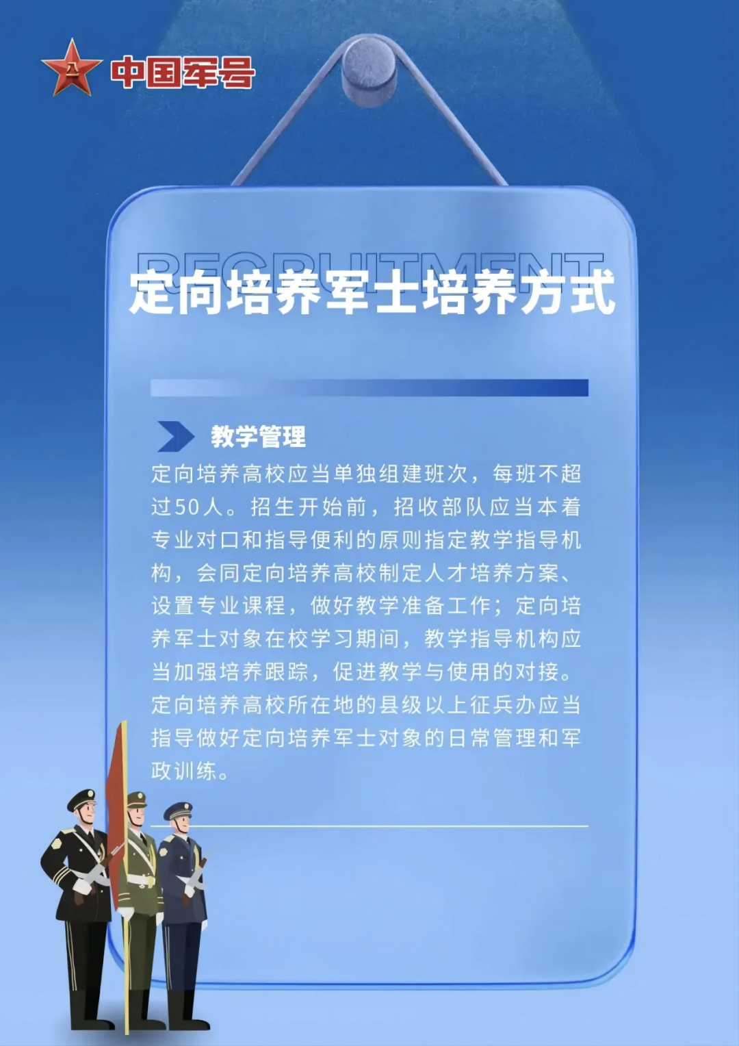 此外,报考定向培养军士的考生如果体格检查、政治考核均合格,但未被招生院校录取的,可报名应征义务兵,同等条件下优先征集。