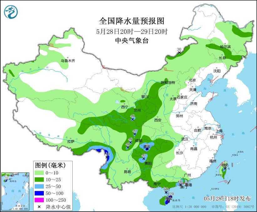 中央气象台预计,28日20时至29日20时,内蒙古河套地区和中部、黑龙江东北部、吉林中北部、西藏东南部、西北地区中东部、西南地区东部和北部、云南西北部、华南南部沿海和海南岛、台湾岛中东部等地部分地区有中到大雨,其中,西藏东南部、重庆西南部、贵州西北部、云南西北部、广东西南部沿海、海南中东部等地部分地区有暴雨或大暴雨。