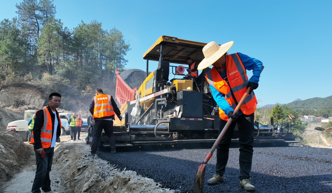 近日,在英山县草盘地镇红花咀至龙家坊村“四好农村路”(红岩线)施工现场,沥青摊铺机和压路机正在同步施工,工人们进行沥青摊铺工作。据了解,红岩线作为草盘地镇连接安徽霍山县太平畈乡的重要通道,建成后将大大缩短了城乡之间的距离,为村民的生活和生产带来便利。