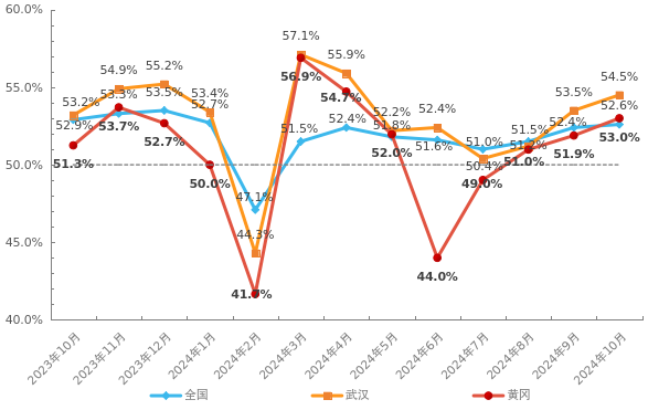 ▲2023年10月-2024年10月全国、武汉和黄冈物流业景气指数走势图