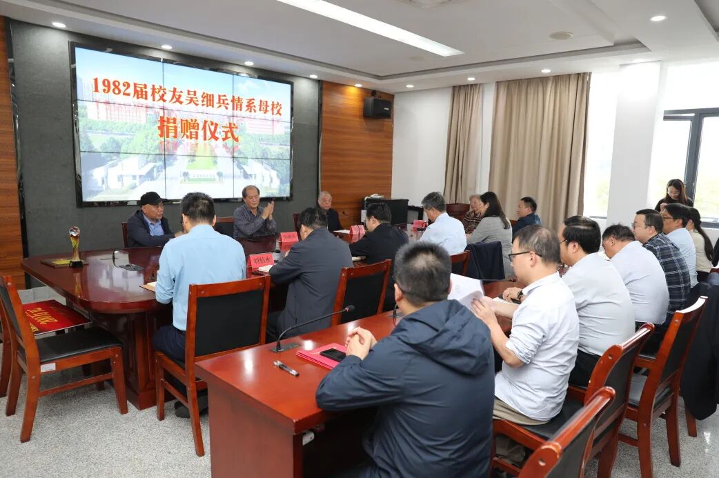 捐赠仪式在二号会议室举行,黄冈中学校领导刘折谷、陈忠新、刘伯永、刘海英、郭旭、秦鹏,退休特级教师洪汉章(吴细兵的高中班主任兼政治老师)及夫人刘书雄老师出席仪式,部分中层干部、教师代表、学生代表参加仪式,仪式由党委副书记、副校长陈忠新主持。