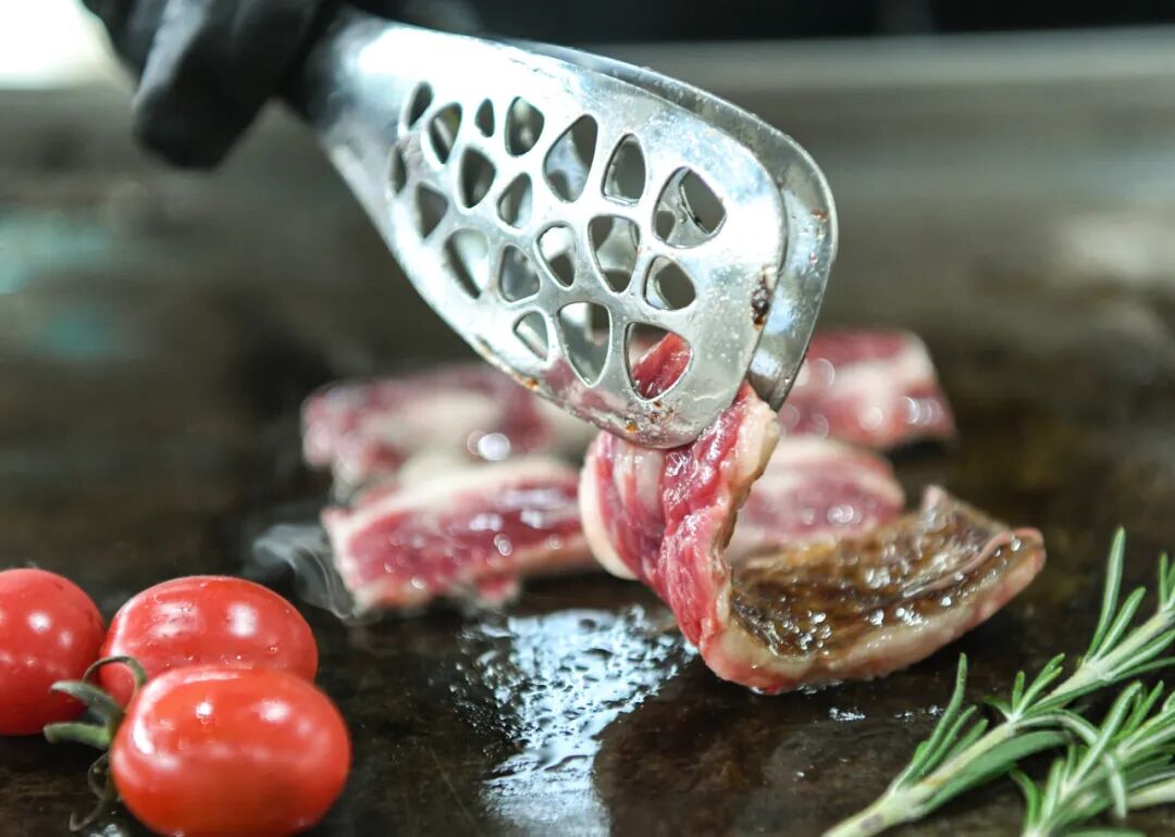 2024年5月19日,在第八届中俄博览会上,参会人员在煎制高品质雪花牛肉。王松摄(新华社)