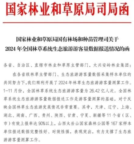 据了解,生态旅游数据包括游客接待量数据和旅游经营收入等相关栏目,是反映全国林草生态旅游发展情况的重要指标。