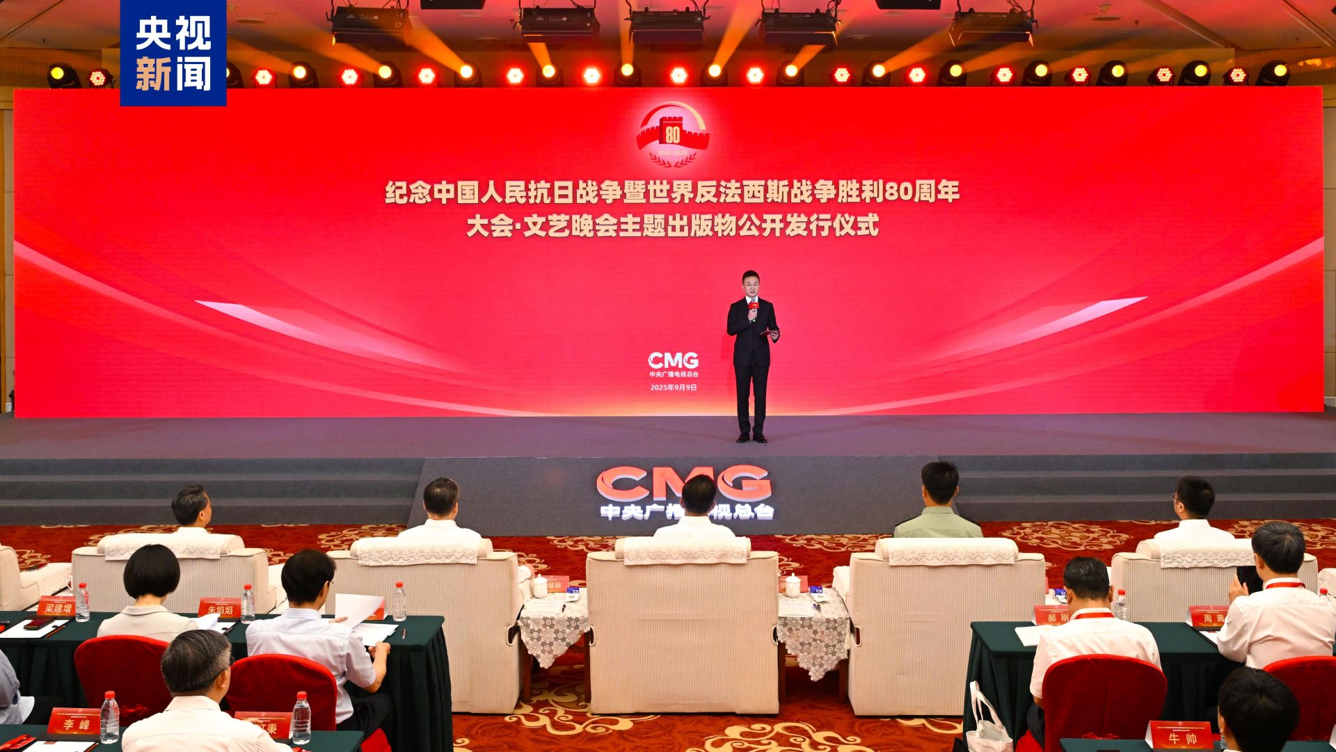 9月9日,纪念中国人民抗日战争暨世界反法西斯战争胜利80周年大会·文艺晚会主题出版物公开发行仪式在京举行。中宣部副部长、中央广播电视总台台长慎海雄出席,并与中央军委政治工作部宣传局副局长毕斌、中宣部文艺局局长陈名杰、文化和旅游部办公厅主任张永新等以及受阅部队官兵代表共同启动主题出版物发行。