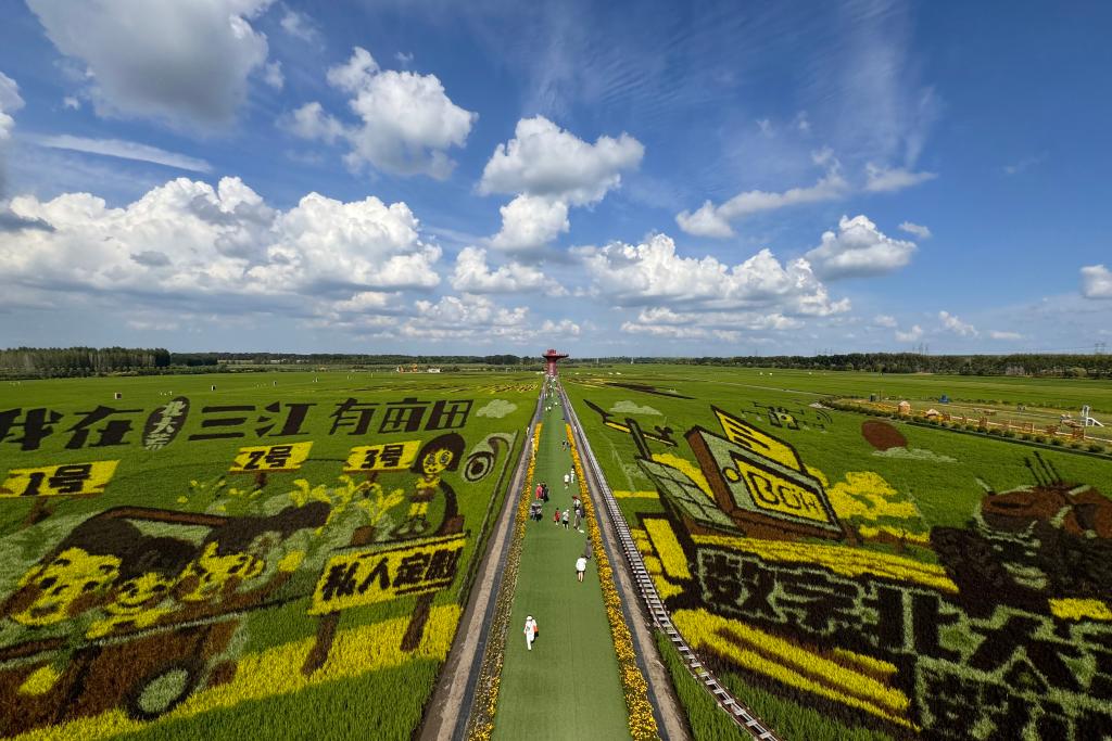 在哈尔滨市木兰县现代农业园区,500亩稻田以大地为卷,以稻禾为笔,绘就“冰城压舱石”的丰收画面。在五常稻香小镇,稻穗摇曳,孩子们可以扮演“农夫”,感受传统农耕文化。哈尔滨市农业农村局副局长陈鑫说,在“中国农民丰收节”期间,五常、方正、延寿等地将举办稻田艺术展、农产品市集、农耕技能大赛等活动。