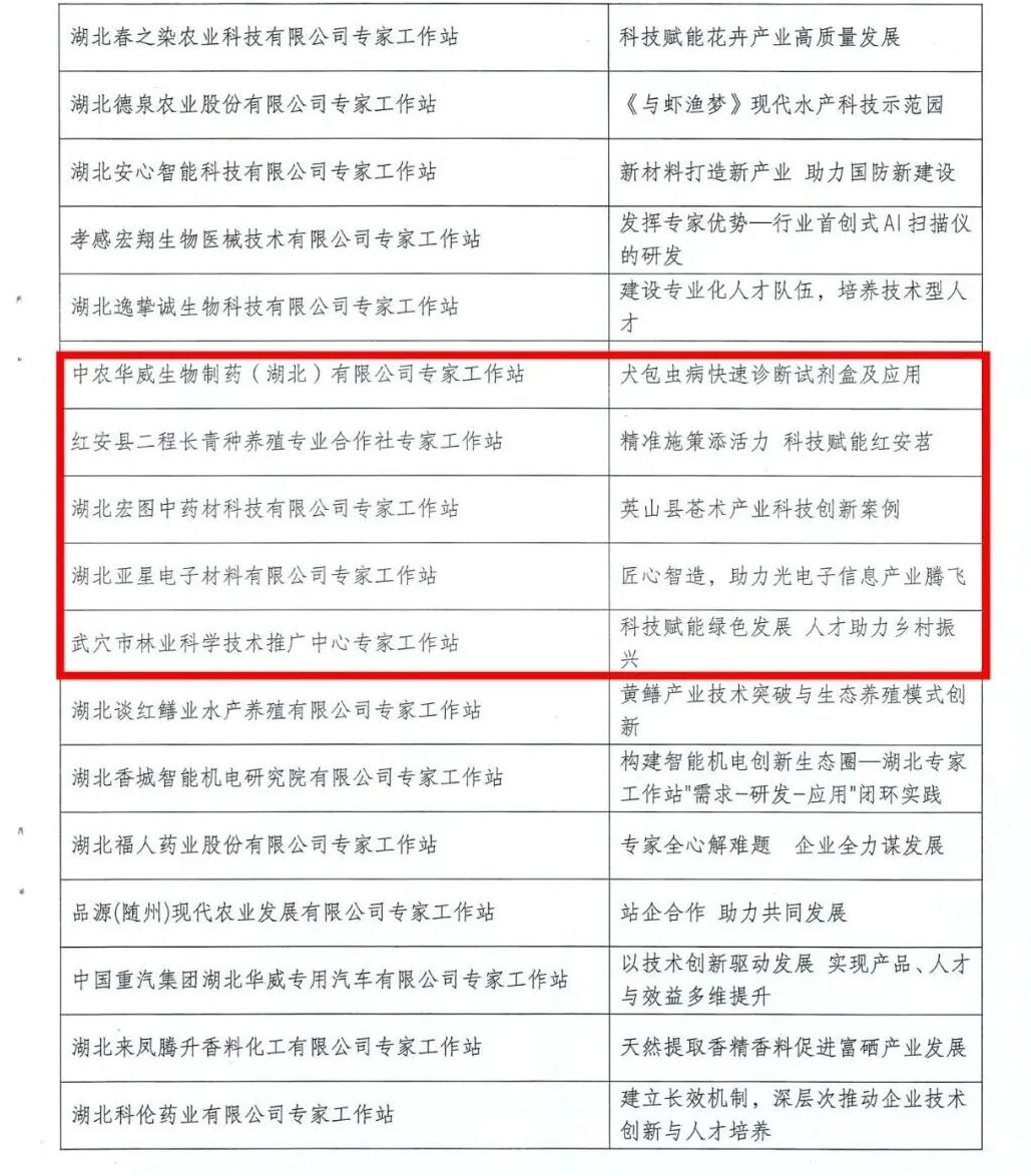 近日,2025年度湖北省院士专家工作站优秀案例名单揭晓,由黄冈市科协推荐的中农华威生物制药(湖北)有限公司专家工作站“犬包虫病快速诊断试剂盒及应用”、红安县二程长青种养殖专业合作社专家工作站“精准施策添活力 科技赋能红安苕”、湖北宏图中药材科技有限公司专家工作站“英山县苍术产业科技创新案例”、湖北亚星电子材料有限公司专家工作站“匠心智造,助力光电子信息产业腾飞”、武穴市林业科学技术推广中心专家工作站“科技赋能绿色发展 人才助力乡村振兴”等5家专家工作站案例成功入选!