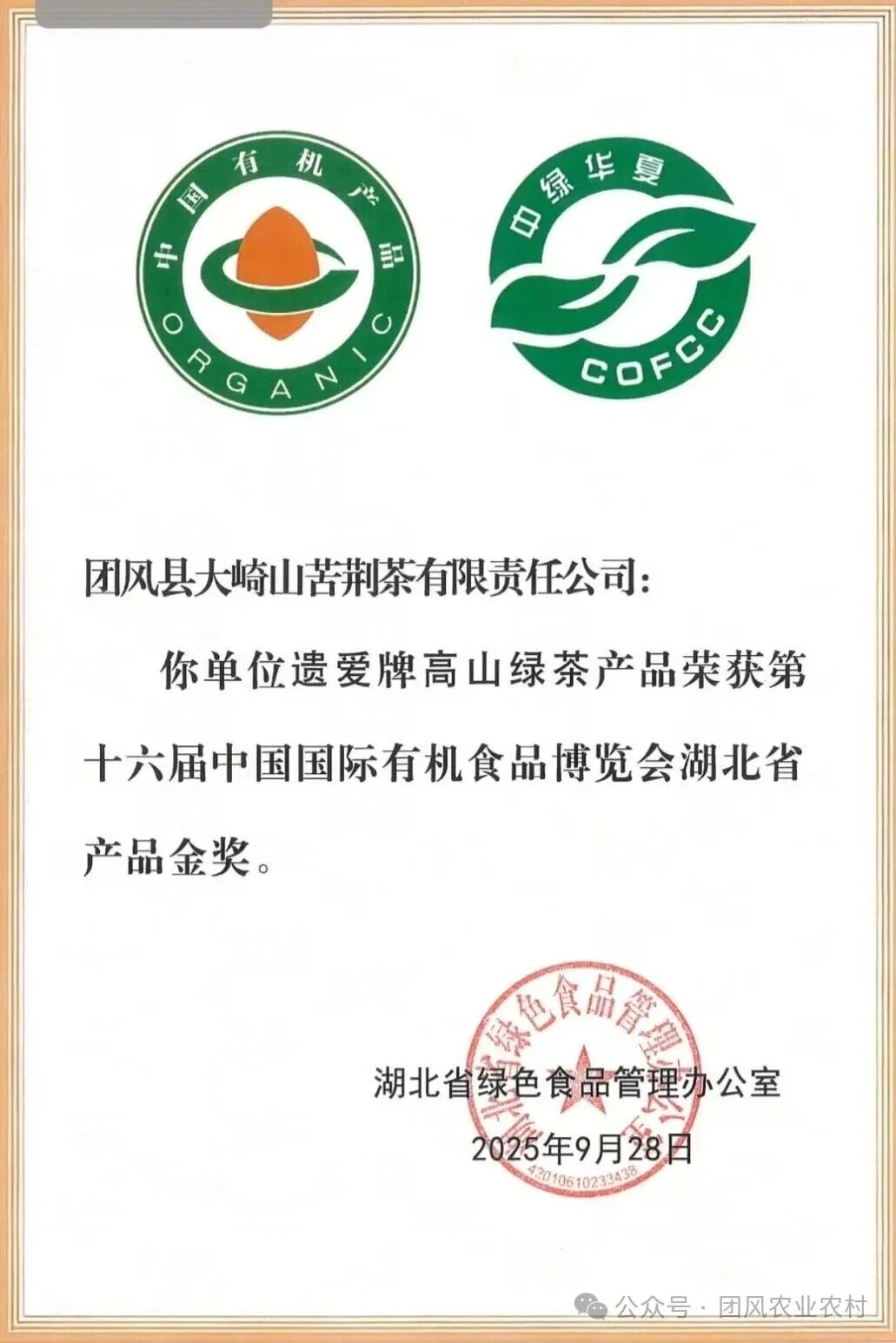 9 月 28 日,团风县大崎山苦荆茶有限责任公司的 “遗爱牌高山绿茶” 产品,成功荣获由湖北省绿色食品管理办公室颁发的第十六届中国国际有机食品博览会 “湖北省产品金奖食品” 证书。这一奖项的获得,不仅是对该产品在品质、有机标准、市场认可度等方面的权威肯定,更是团风县农业品牌建设成果的生动体现,进一步提升了 “遗爱牌高山绿茶” 市场知名度与影响力。