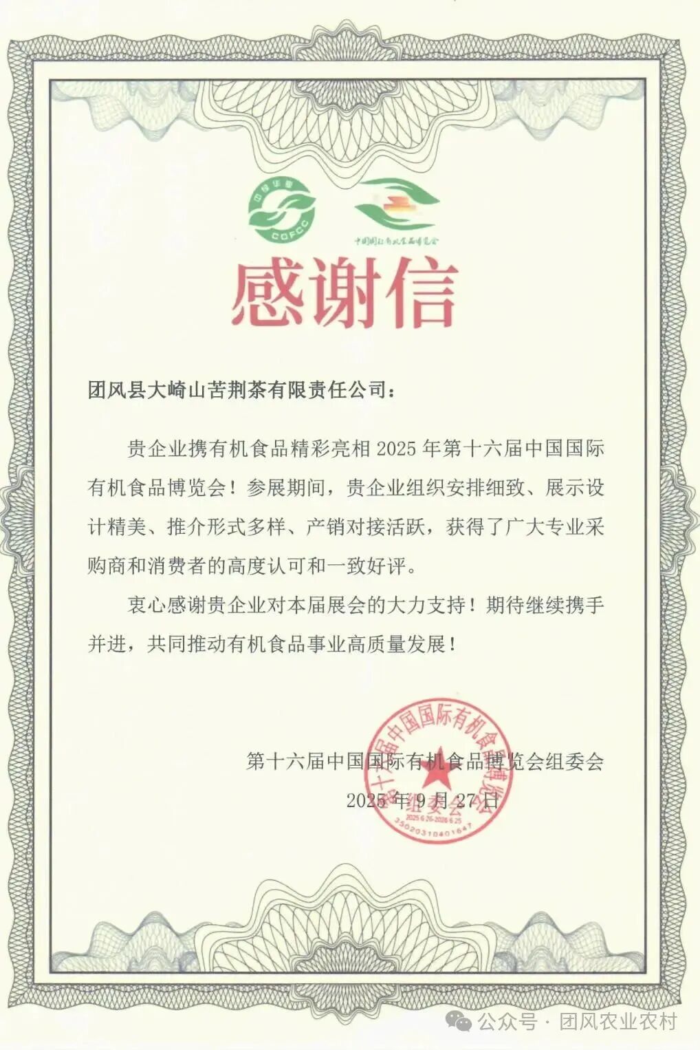 展会落幕不久,荣誉喜讯接连传来。9 月 27 日,团风县大崎山苦荆茶有限责任公司收到了第十六届中国国际有机食品博览会组委会发来的感谢信。信中对该公司在展会期间的出色表现给予高度评价,并表达了期待未来继续携手并进,共同推动有机食品事业高质量发展的良好愿望。