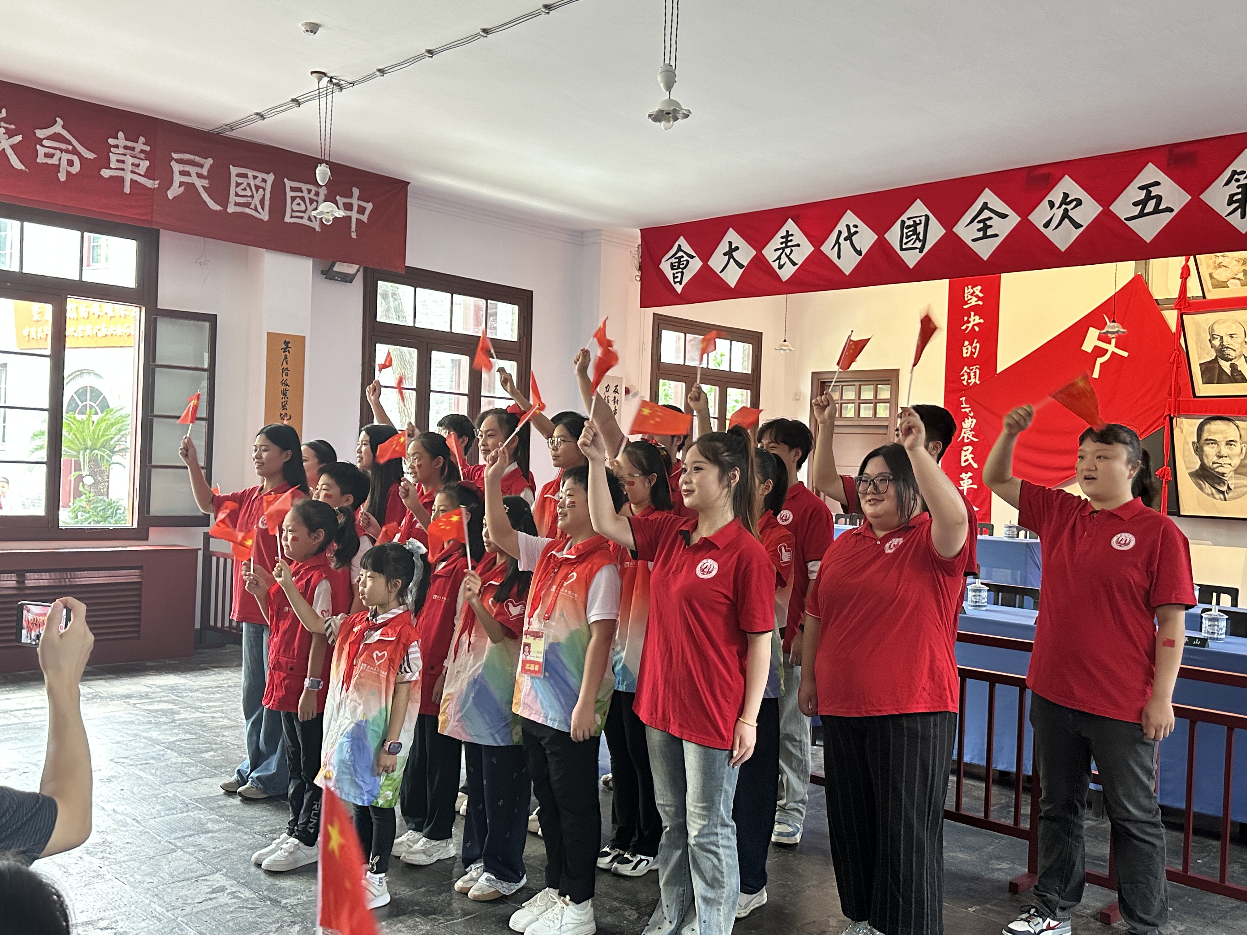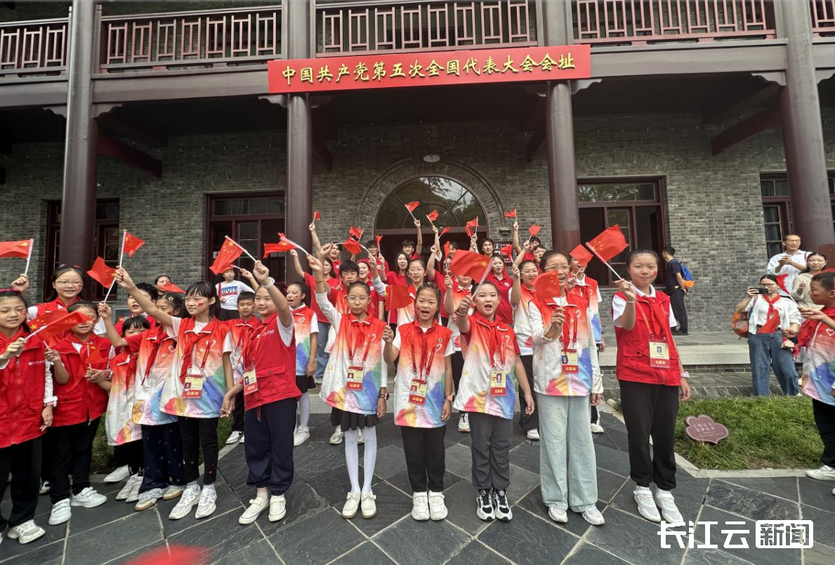 20余名表演者手持红旗,以一首《我的祖国》深情开唱,“一条大河波浪宽”的悠扬旋律瞬间吸引游客驻足。步入纪念馆院落,铿锵有力的《团结就是力量》随即响起,“红巷苗苗”们并肩而立,以饱满的童声展现万众一心的力量,仿佛将观众带回烽火连天的抗战年代。随后,《游击队歌》《没有共产党就没有新中国》等歌曲在纪念馆各处回响。活动尾声,全体参演者汇聚于中共五大会址开幕式会场门口,红旗挥动,歌声清澈嘹亮,一曲《歌唱祖国》大合唱将气氛推向高潮,演唱者们带领观众齐声高歌,用最真挚的歌声诉说对祖国的深情。