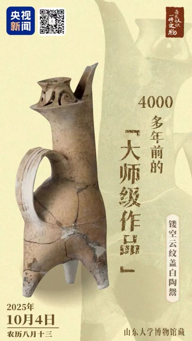 镂空云纹盖白陶鬹(guī)造型是“软萌可爱的小鸟”,头上还戴着一顶优雅的“小帽子”,镂空盖的造型像流动的云朵,又像飘出的水汽。这只“小鸟”看着轻巧,但制作难度却是来自史前工匠的“硬核”手艺,堪称当时的“大师级作品”。