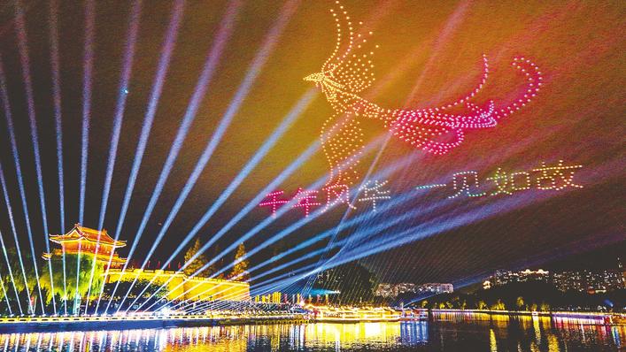 “当数百架无人机在荆州古城上方定格为虎座鸟架鼓、越王剑及楚辞诗句时,我的脑海里只有八个字:千年古城,一见如故。”10月3日,从郑州自驾到荆州的游客徐帆,被荆楚文化深深震撼。今年国庆中秋“双节”,荆州文旅市场用“文旅+科技”的古今碰撞,打造了一系列沉浸式新场景、新业态,让浓郁的烟火气与穿越千年的历史感,交织出楚韵十足的假日图景。(湖北日报全媒记者 何辉 通讯员 周栎 刘秋娥 摄)