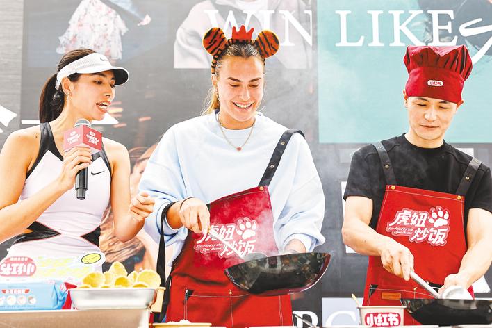 10月4日下午,武网“三冠王”萨巴伦卡掌勺颠锅,为粉丝炒饭。 (湖北日报全媒记者 任勇 摄)