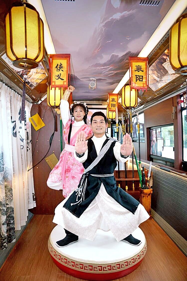 这辆由襄阳公交集团精心打造的“侠义襄阳”旅游公交,于10月1日正式发布,成为全国首辆以金庸武侠为主题、融合襄阳本土文化特色的公交车。它不仅在外观上进行了全新涂装,更在内部做出大胆突破,将旌旗、花灯、大鼓等古风元素搬进车厢,营造出一个可移动的文旅新场景。