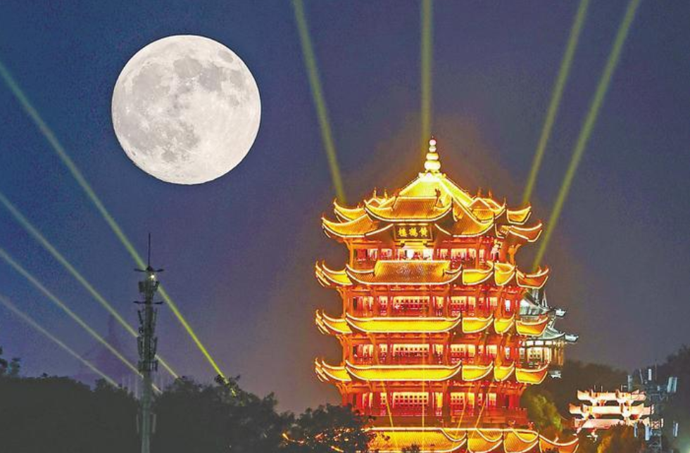 10月6日晚,中秋佳节,武汉黄鹤楼上明月高悬,极具诗意。(注:图片使用多重曝光现场拍摄 湖北日报全媒记者 何宇欣 摄)
