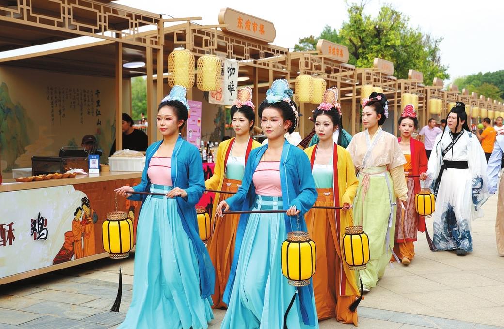 演出结束后,许多观众还意犹未尽。剧场外的东坡诗词打卡墙前,不少人在拍照留念;旁边的美食市集里,游客们品尝各色小吃。
