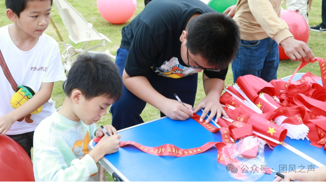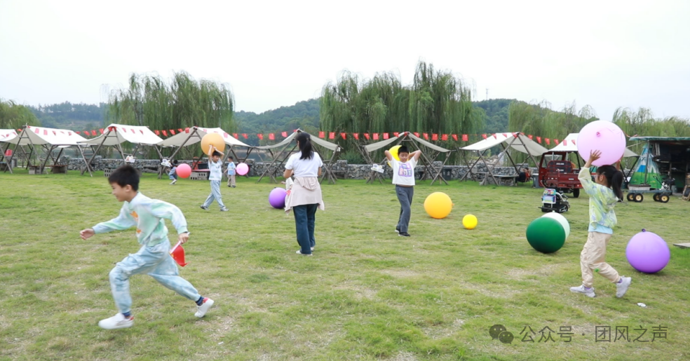 参与“写祝福语得气球”活动的孩子们,在领取到心仪的气球后,立刻在广阔的草坪上你追我赶,尽情奔跑嬉戏,纯真的笑脸与秋日美景相映成趣。