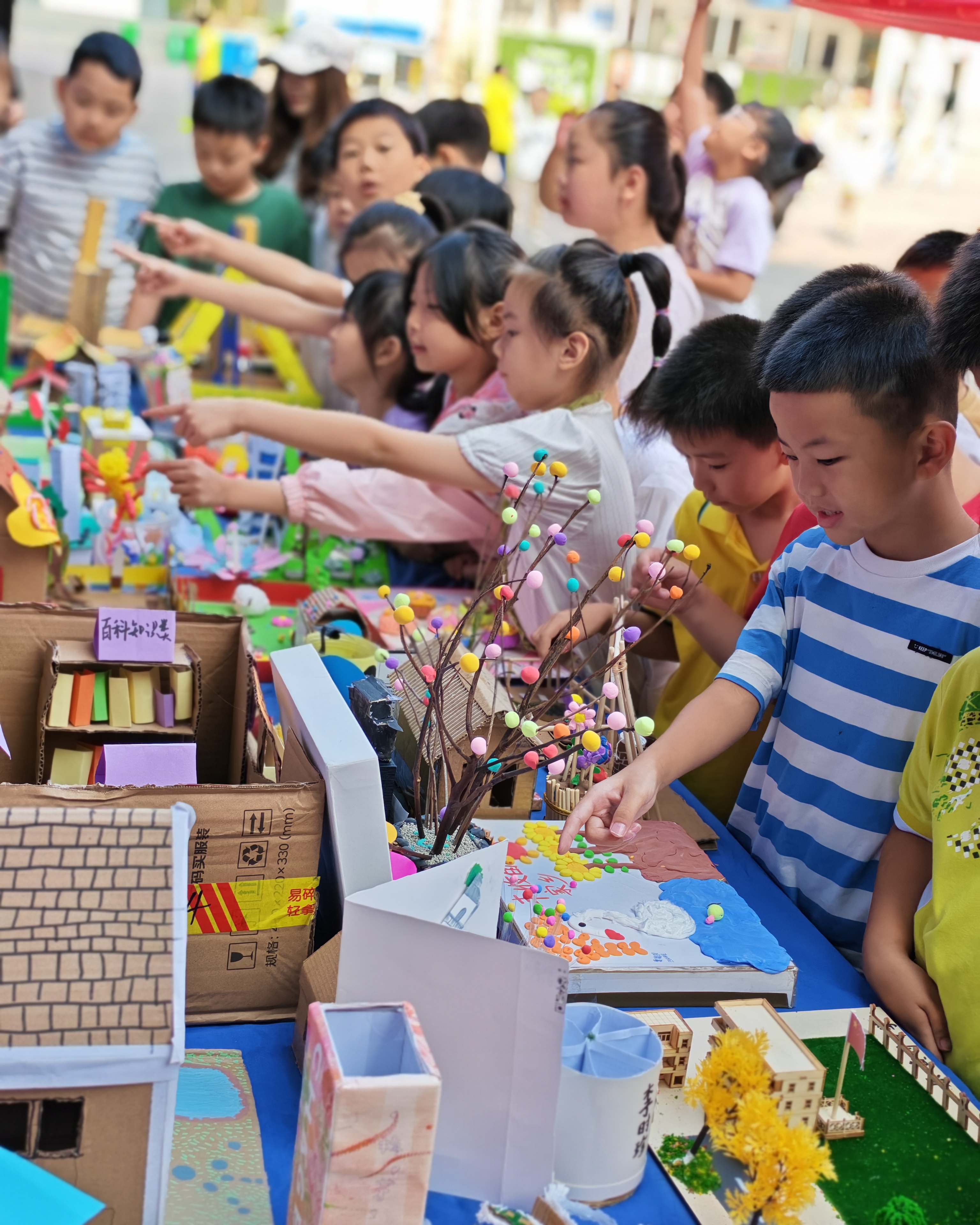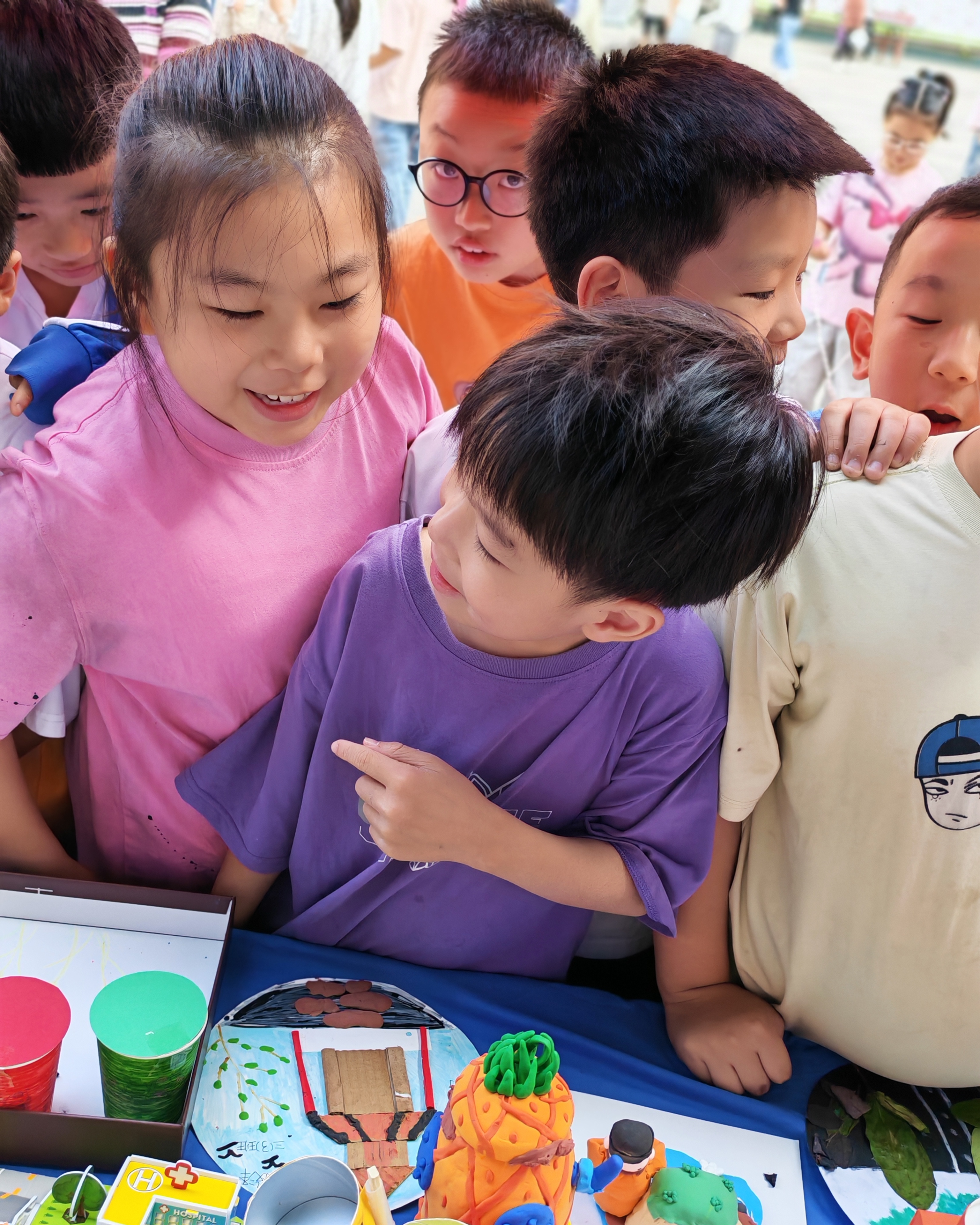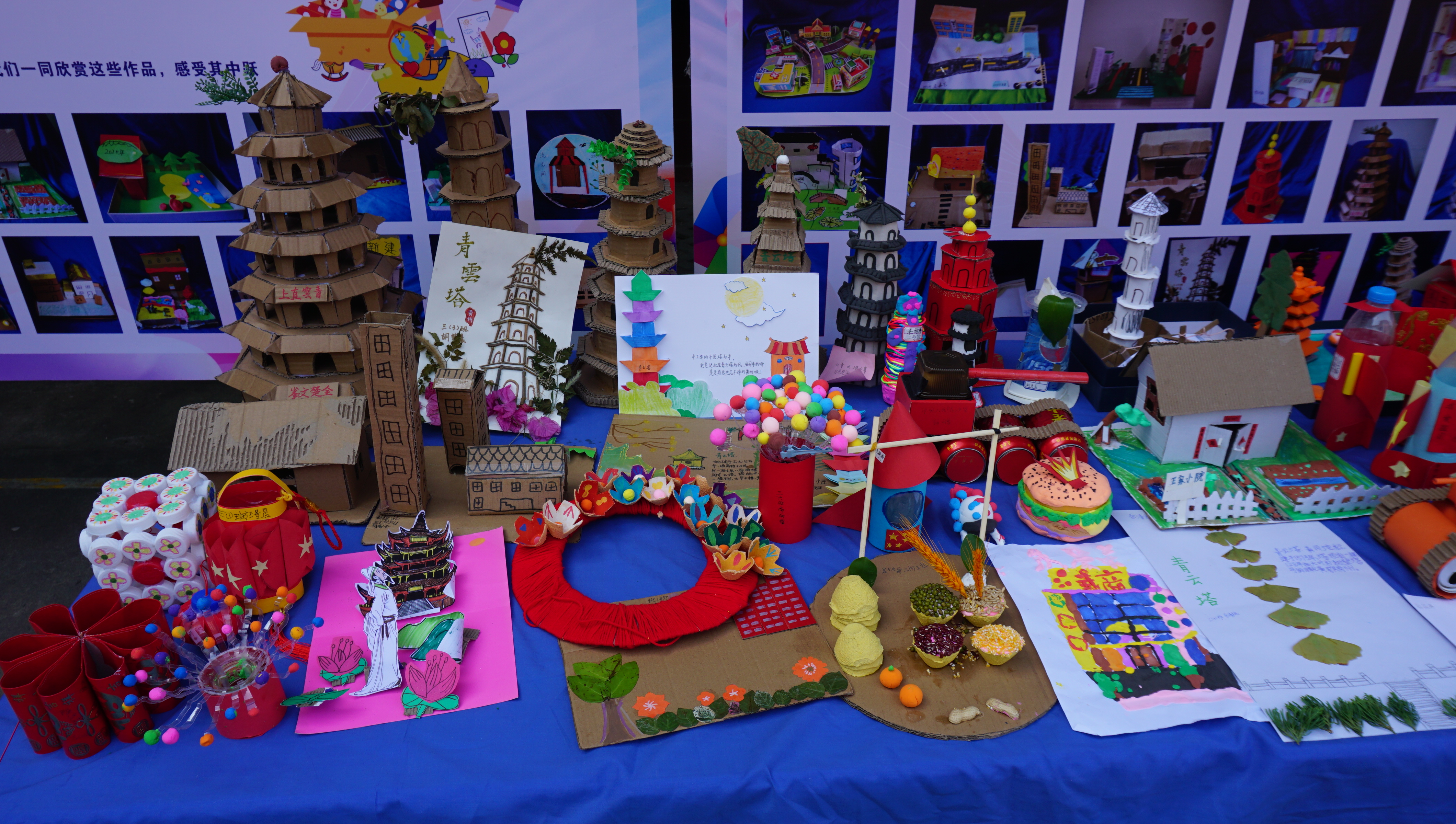 三、四年级学生围绕“创国庆美作·赞家乡变化”主题,利用纸盒、瓶盖等废旧材料,动手制作“家乡发展模型”。鄂黄大桥、青云塔、汉川门等地标在他们的巧手中栩栩如生,展现出家乡黄州的发展变迁。学生在讲述作品故事的过程中,进一步增强了对家乡的认同与自豪。