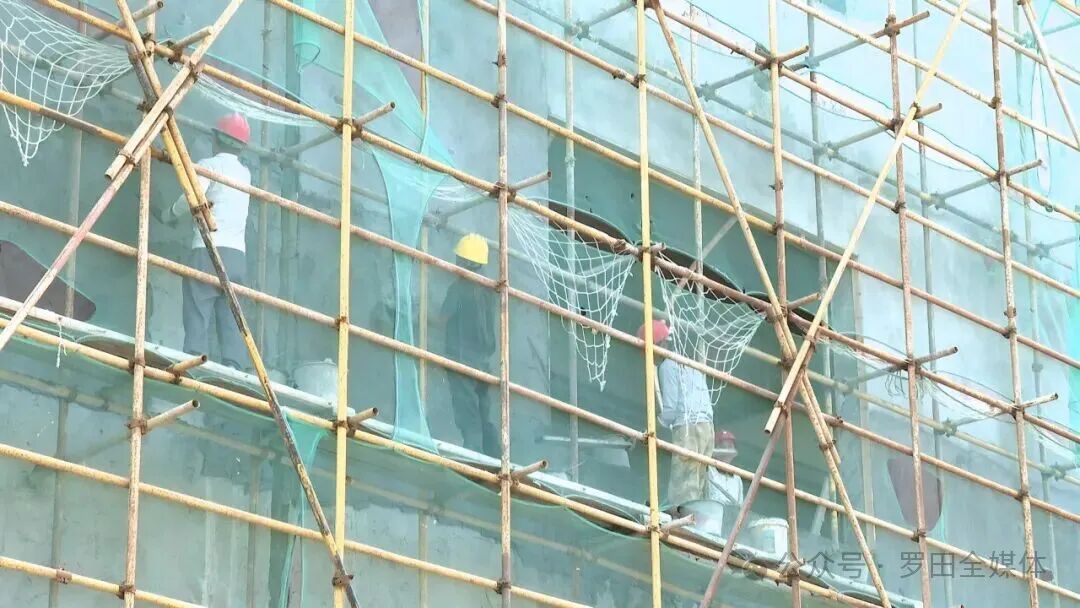 施工现场塔吊高耸,巨大的机械臂灵活抓取建设材料,工人们正忙着进行外墙粉刷、钢管搬运、石沙转运、石灰混合等工作。