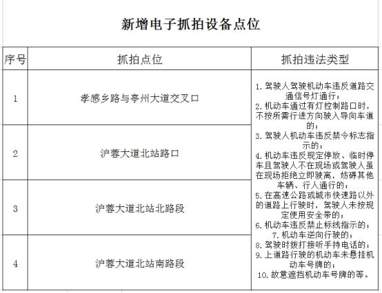 自2025年11月1日起,麻城市公安局交通管理大队在麻城市部分路段启用交通技术监控设备,针对驾驶人驾驶机动车违反道路交通信号灯通行、违反禁令标志、违反禁止标线指示、逆向行驶、不按导向车道行驶等交通违法行为,实施定点抓拍并依法处罚。