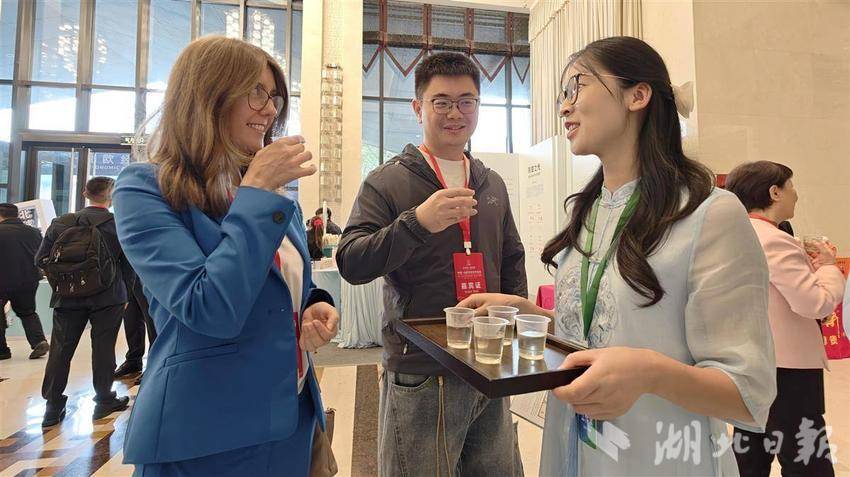 “very refreshing(非常爽口)”“so nice(很美味)”10月15日,在武汉开幕的2025中国-北欧经贸合作论坛暨中国湖北-欧洲经贸洽谈系列活动上,英山云雾绿茶、红茶飘香会场,其展区前众多外宾驻足品鉴,无不对中国茶道的东方美学赞不绝口。