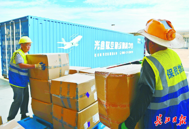 全国首家网状驳运型航空前置货站——“光谷货站”工作人员在卸货。长江日报记者高勇 摄