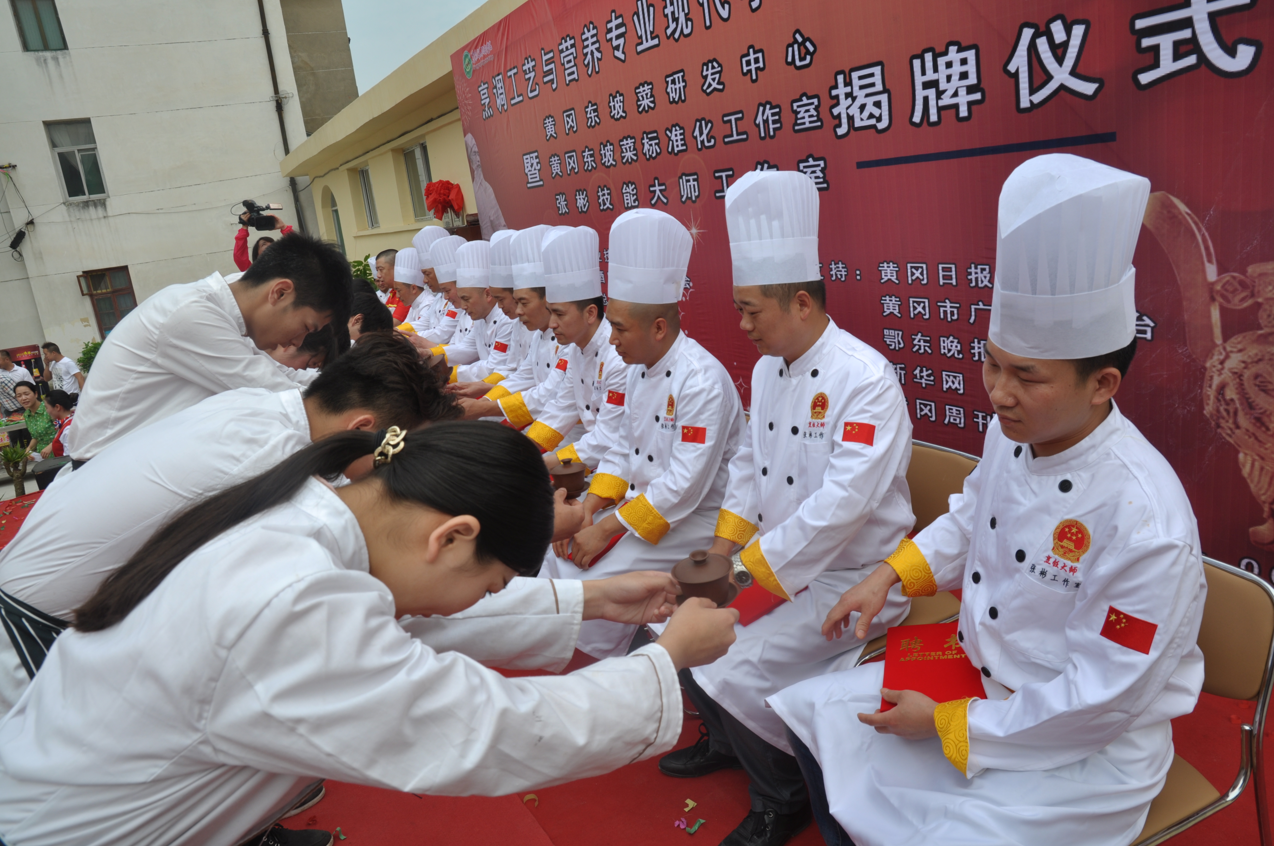 受益于这一试点建设,国家级烹饪工艺与营养专业生产性实训基地、中国黄冈东坡菜研发中心、中国黄冈东坡菜标准化工作室、中国烹饪大师(张彬)创新工作室先后迅速在黄冈职院落成。曾任黄冈大东方行政总厨的张彬以及来自黄冈、武汉各知名餐饮公司的11名总厨、大厨成了师傅,手把手带徒授艺。