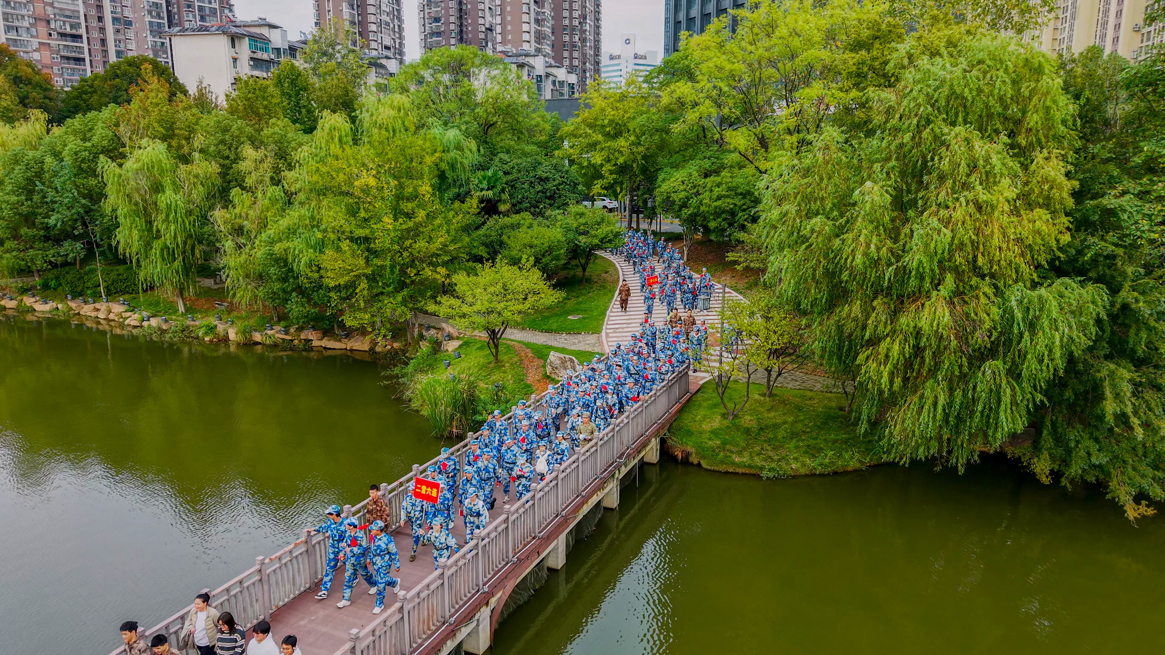 序幕落,征程启。遗爱湖校区的新生们沿着风景如画的遗爱湖环线,何家湖校区的队伍则在校门外何家湖环线,分别开启了十公里行军拉练。