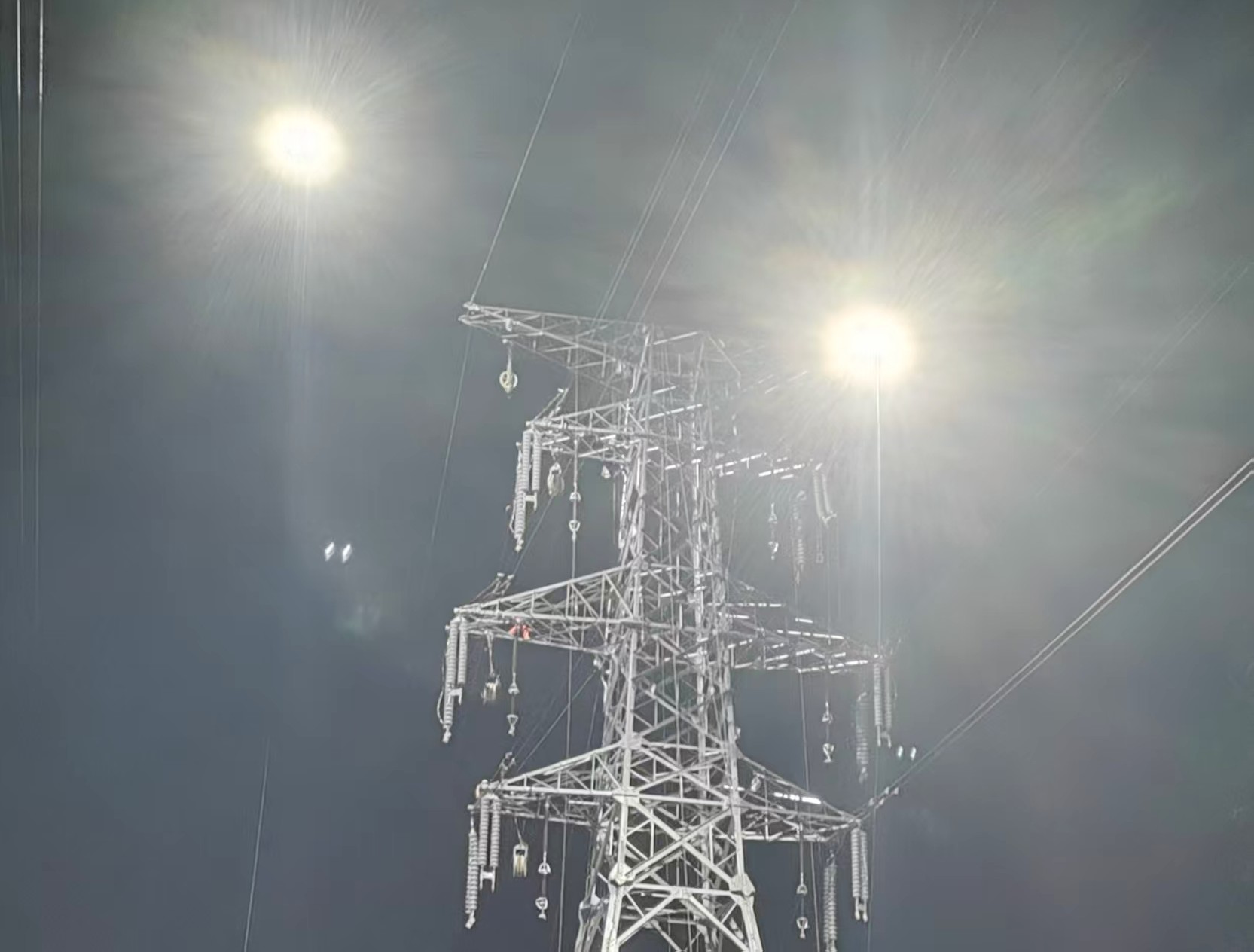 照明、防护工序完成后,夜间拆、架线施工随即开始。半空中,施工人员如同“蜘蛛侠”般攀爬于角钢塔上,精准地剪断一根根旧导线,并通过牵引绳拖至地面,随后架设、压接新导线;地面上,施工人员紧盯牵张设备,缓缓展放导线。黑夜里的寒意,挡不住建设者的火热激情。