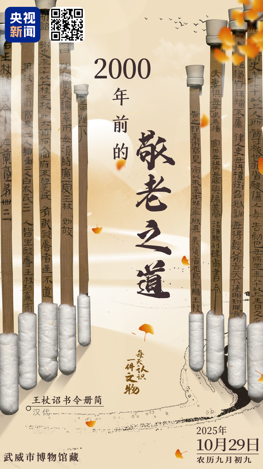 王杖诏书令册简,收藏于武威市博物馆。26枚木简详细记录了汉代的官方养老制度,堪称当时的“老年人权益保障法”;上面还记述了汉代给高龄老人的“赐王杖”制度,王杖是当时发给七十岁以上老人的优待凭证。它为研究汉代尊老养老制度,提供了十分重要的实物资料。