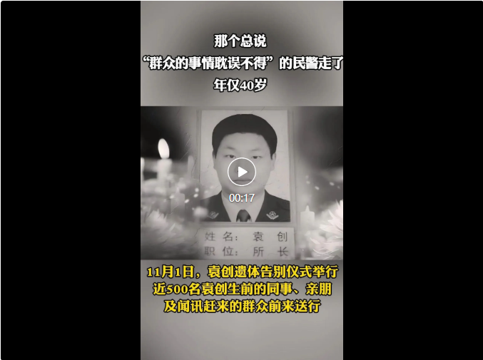 10月27日,袁创在金家铺派出所备勤室突发疾病,经抢救无效因公牺牲,年仅40岁。