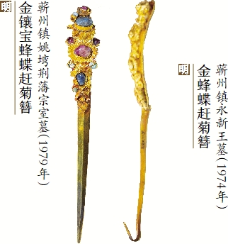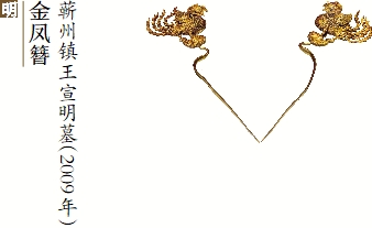 这对出土于蕲州王宣明墓的金凤簪,簪首凤踏祥云造型。凤鸟圆眼、花冠、凤角飘扬,口衔一环,昂首挺胸,振翅翘尾作欲飞状,口含金丝,原应垂挂有凤口衔环,用以悬挂挑牌,足踏祥云。凤身、翅、尾及飞云累丝制成,透空。簪身扁平,近簪顶处弯曲。此器采用累丝工艺,制作精细,形象逼真,宛若天成。