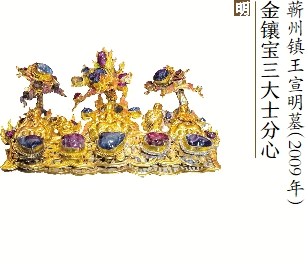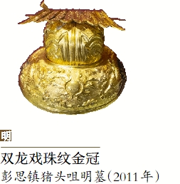 金冠顶是女子戴在发髻上面的发罩,在上面插戴各式簪钗,又有“发鼓”之称,为已婚女子佩戴之物。双龙戏珠纹金冠顶下部圆口,正面锤揲双龙戏珠纹。中部近圆球形,正面锤揲海水纹。上部直边尖角莲花形,满饰花纹。金冠尺寸不大,刚好可以扣于高髻之端。据《荆藩家乘》(《朱氏宗谱》记载:都昌王朱祁鑑妃袁氏葬于永福乡猪头咀。地名与此墓所葬处相符。朱祁鑑为荆宪王朱瞻堈嫡二子,正统八年封,成化十三年薨。