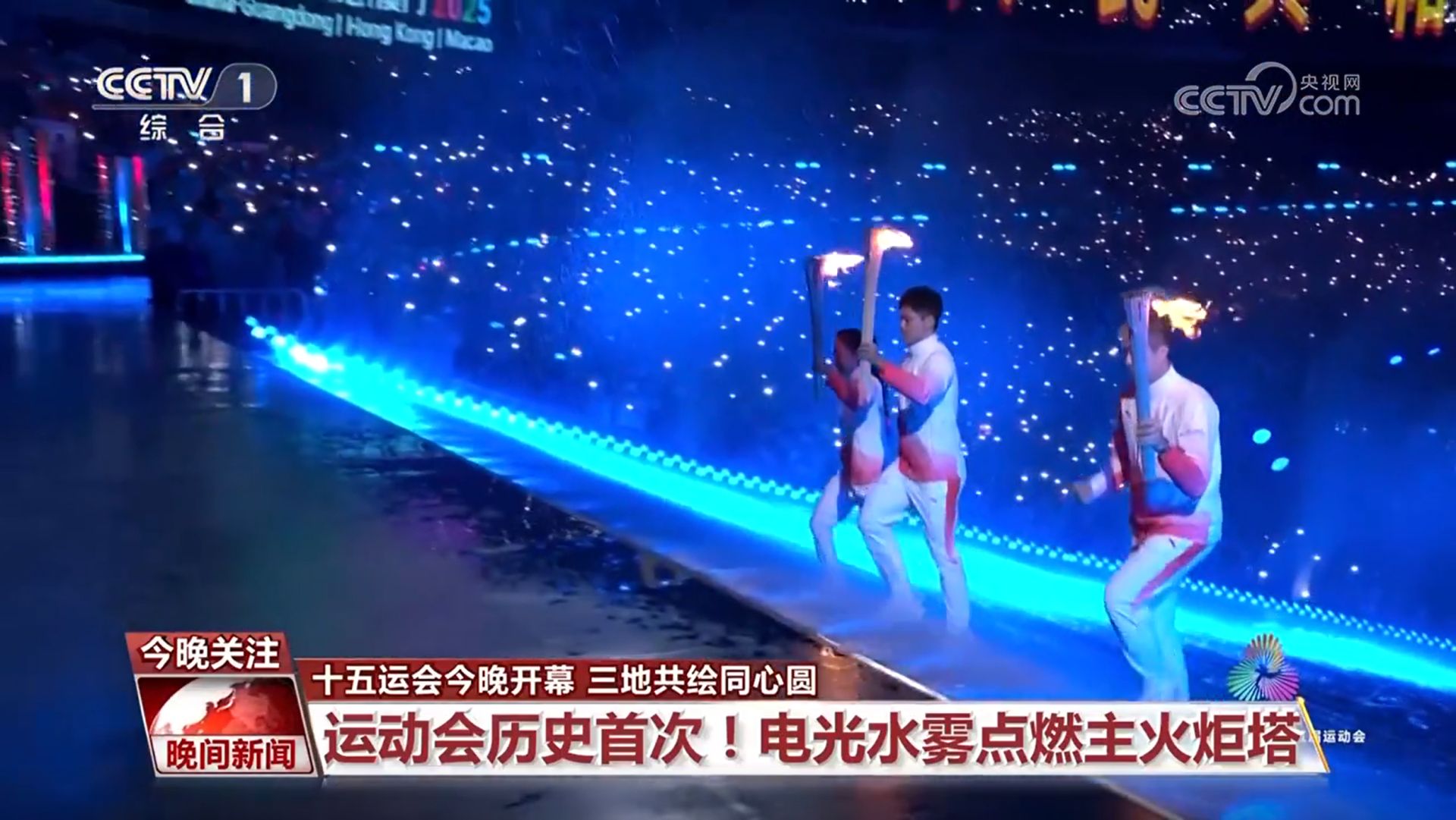最后时刻意想不到的惊喜就是在大家最为关注的主火炬塔点火环节。本届全运会的源火来自深海1522米的可燃冰已经让大家很震撼了,开幕式上主火炬塔被点燃的瞬间又给大家带来了惊喜。秉持绿色理念,主火炬塔燃起的并不是真实的火焰,而是由电光水雾系统模拟的“科技火焰”。