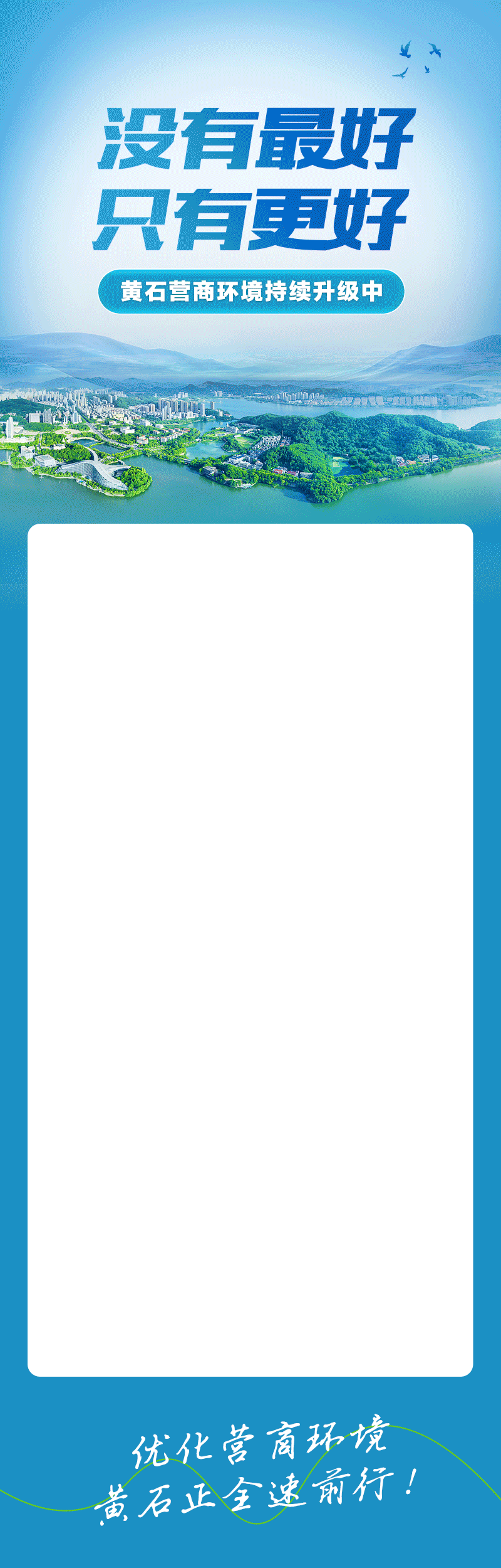 环境如水,发展如鱼,海阔方可凭鱼跃。黄石不光营造高效便捷的政务环境、公正透明的法治环境、守约践诺的信用环境,更加坚定地打造亲商安商的人文环境。