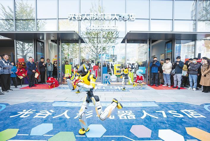 人形机器人在机器人7S店门前表演。(湖北日报全媒记者 魏铼 摄)