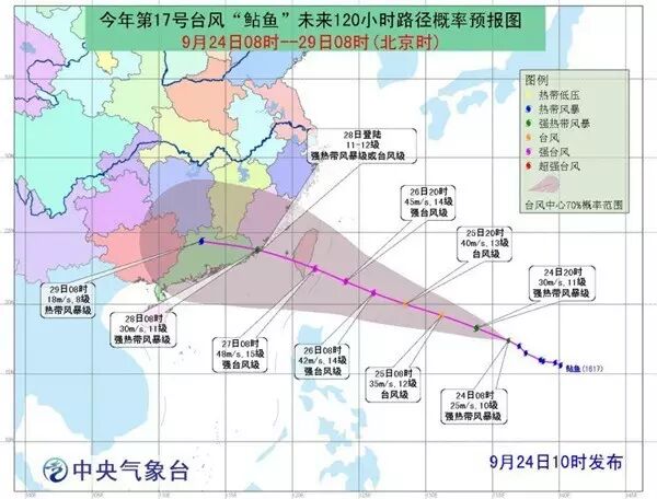 中央气象台消息,今年第17号台风“鲇鱼”已于今日上午8时加强为强热带风暴级,预计“鲇鱼”强度最强可达强台风级(45-50米/秒,14-15级)。从路径概率图来看,“鲶鱼”很可能国庆假期前登陆:27日前后登陆或擦过台湾南部后向闽粤沿海靠近,将于28日前后在福建南部到广东东部一带沿海登陆(30-5米/秒,11-2级)。