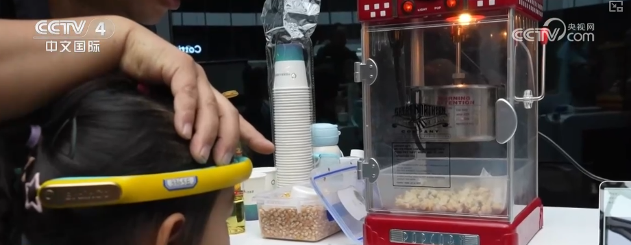 在脑电波互动体验区,头戴轻量化传感设备,集中精神便可专注地用“意念”控制赛车速度。用“意念”烹饪爆米花、抓娃娃等,曾遥不可及的幻想眼前变现。
