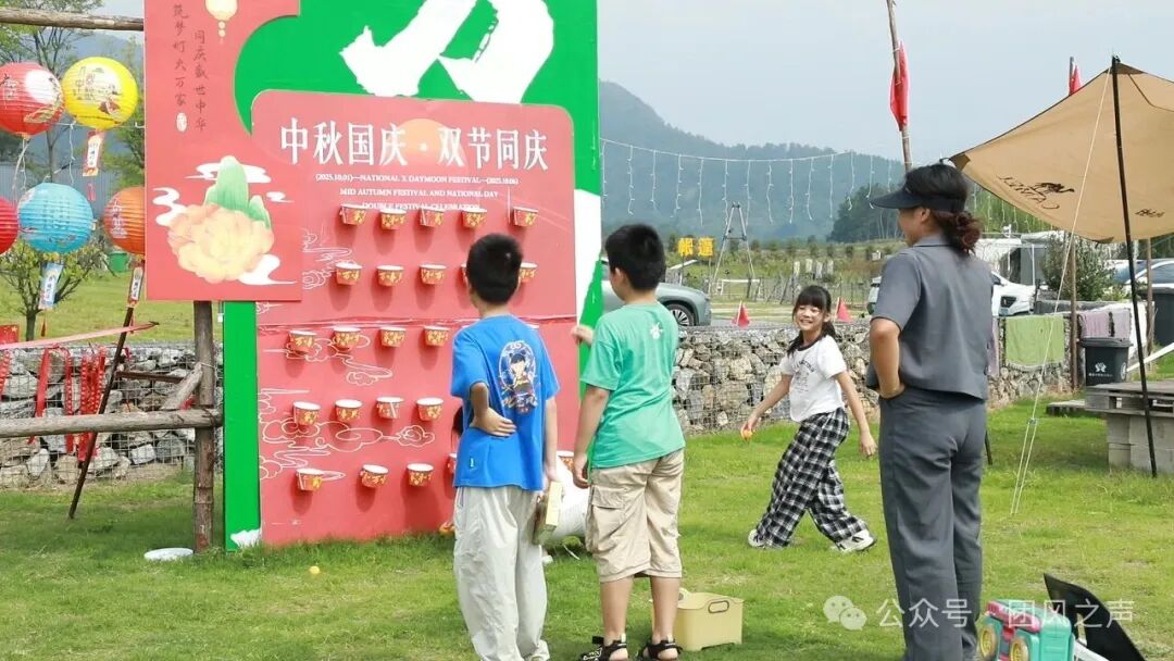 孩子们欢快地荡秋千,家长带领孩子体验投射等游戏项目,家庭式露营区域亦人气高涨。