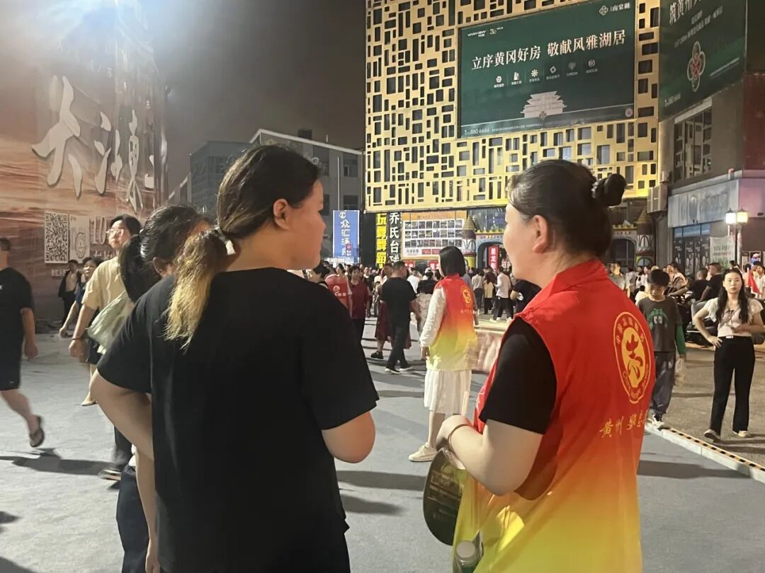 随着夜色渐浓,活动现场的市民和游客数量不断攀升。在遗爱湖东坡夜游点位,面对游客关于游玩路线的询问,志愿者们耐心细致地指明方向,还主动分享最佳观赏时间与拍照打卡点;遇到携带行李、推着婴儿车的游客,他们及时上前提供帮扶。而在东坡外滩《大江东去》商演活动外场,志愿者们则分成2组,承担起取票售票引导与秩序维护的重任,一边引导游客前往指定地点有序操作,一边提醒大家保管好随身物品,避免拥挤,确保每位市民和游客都能顺利入场观看演出。