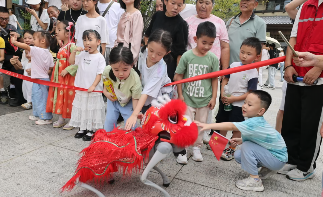 大戏台前,一场跨越古今的对话正在上演。江西游客李女士的孩子,正与机器狗互动。“原本担心孩子对戏曲不感兴趣,没想到机器人一亮嗓,唱起《女驸马》,他立马就被吸引住了!”李女士惊喜地说。一旁,机器狗踩着鼓点“舞狮”,机械舞狮队灵动腾跃,科技与传统的碰撞,引来游客阵阵掌声与合影。