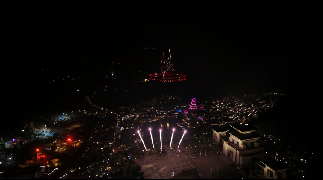 夜空下,东山问梅村的璀璨仍在继续:数百架无人机腾空而起,次第变幻出黄梅戏经典角色、五星红旗、灵犀一指等图案,与打铁花等表演交相辉映,引来掌声如潮。全新编排的水幕黄梅戏《白蛇问情》中,白娘子踏水而来的数字光影,让杭州游客王先生直呼“像走进了传说里”。