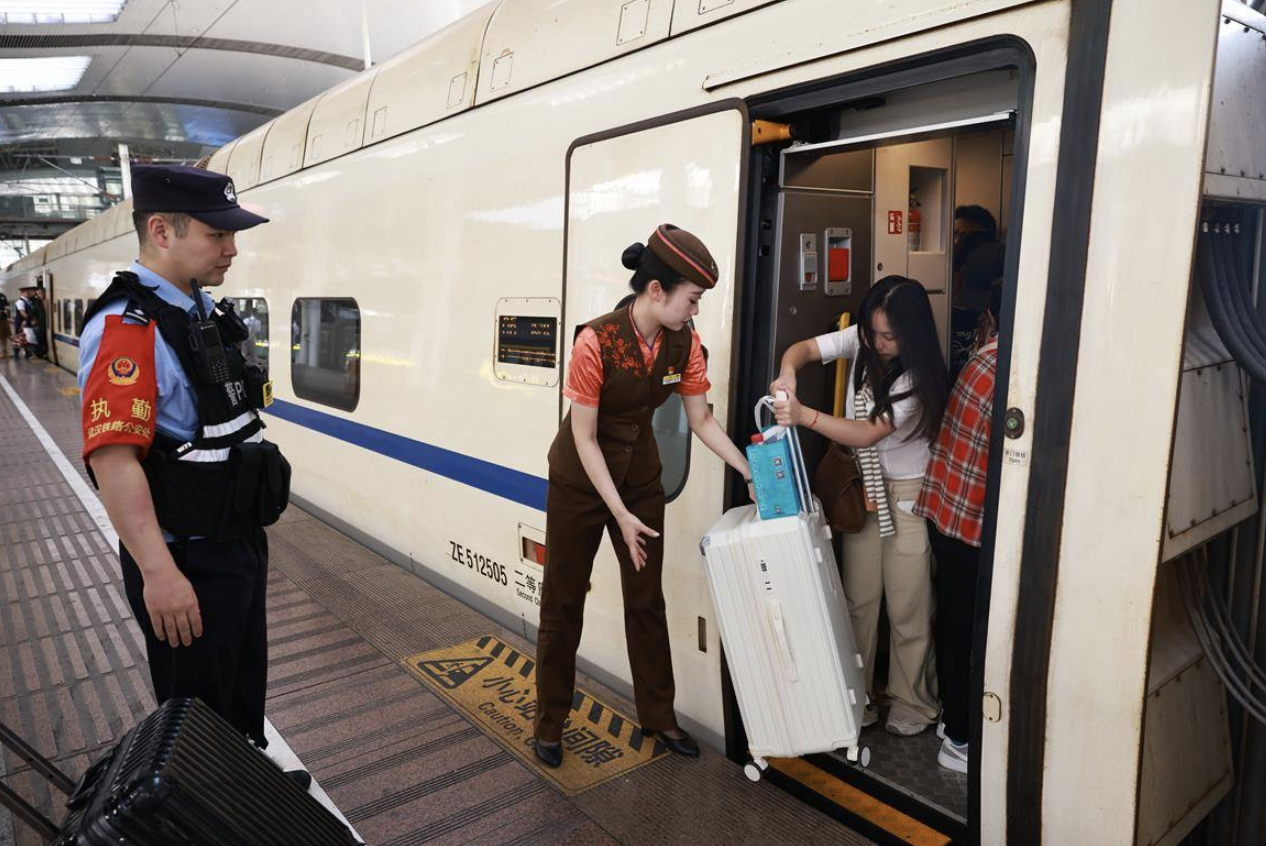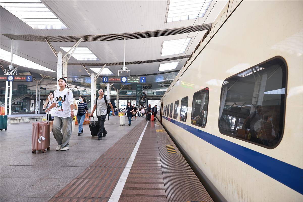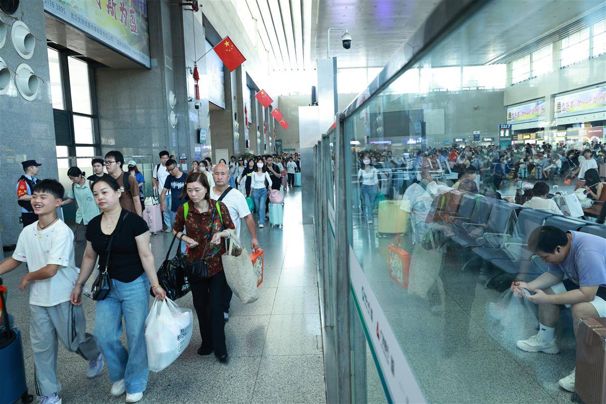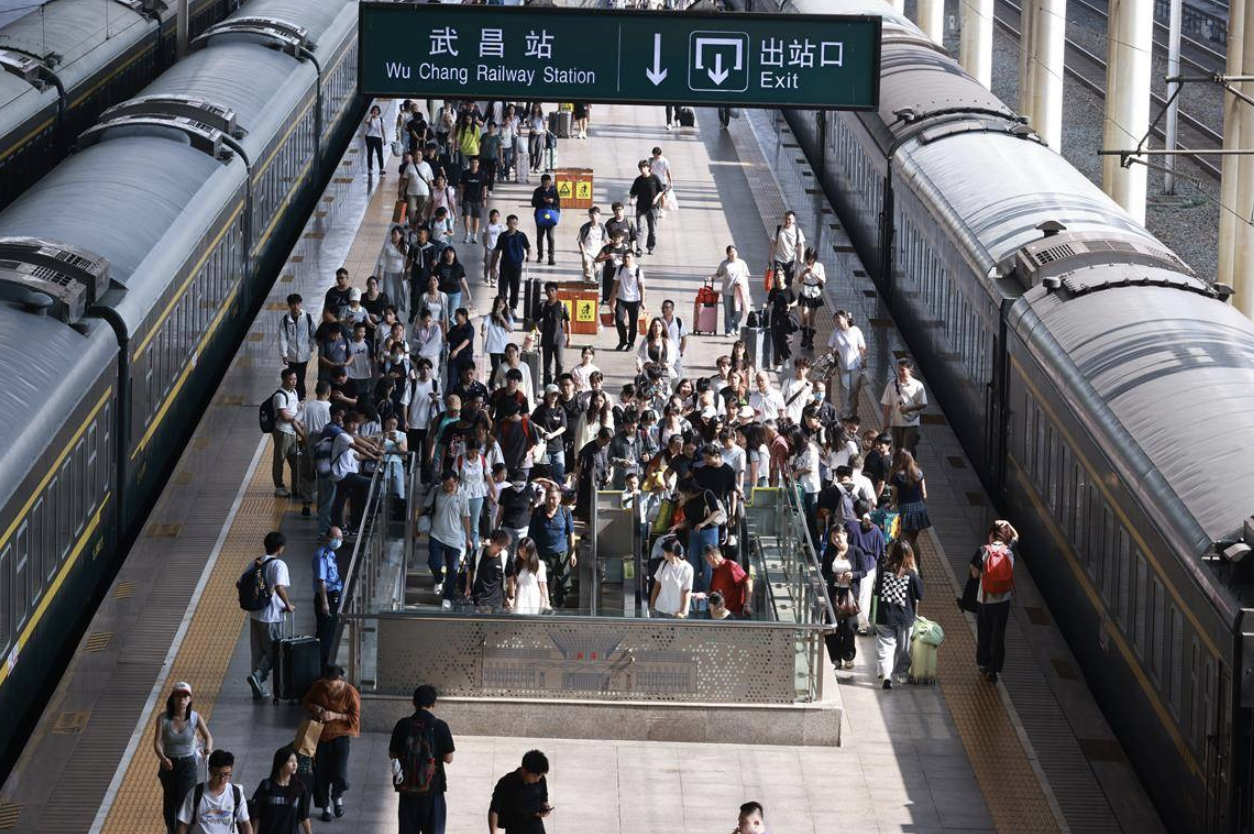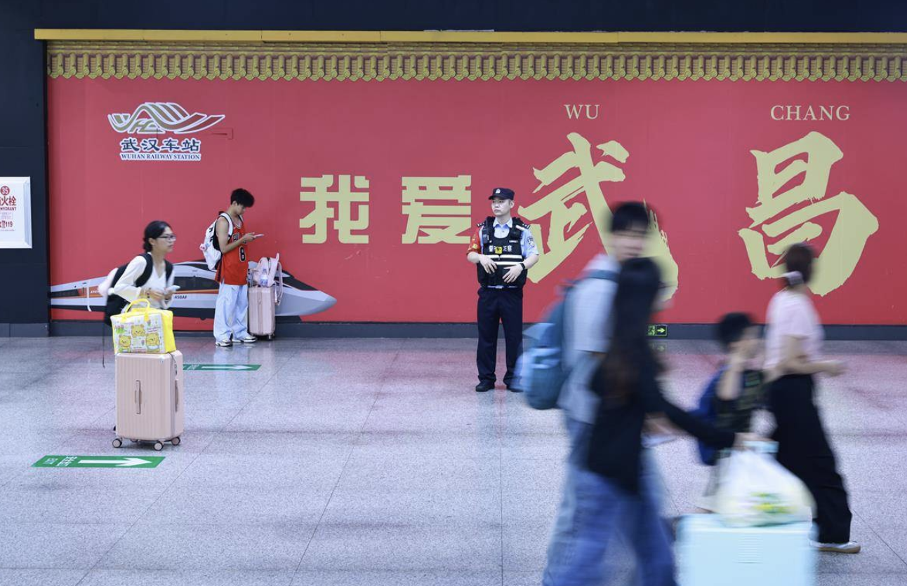 10月7日,武昌火车站内旅客有序乘车、抵达。当日,武汉铁路各大车站迎来返程高峰,仅武昌站就发送旅客6.4万人次、到达旅客10.8万人次。为保障旅客平安返程,武汉铁路公安以“主动警务、预防警务”理念为指引,通过“一站一方案”精准举措坚守岗位;武汉客运段则聚焦旅客出行需求,将精细化服务与动态运力调配相结合,共同为国庆假期运输安全顺畅保驾护航。