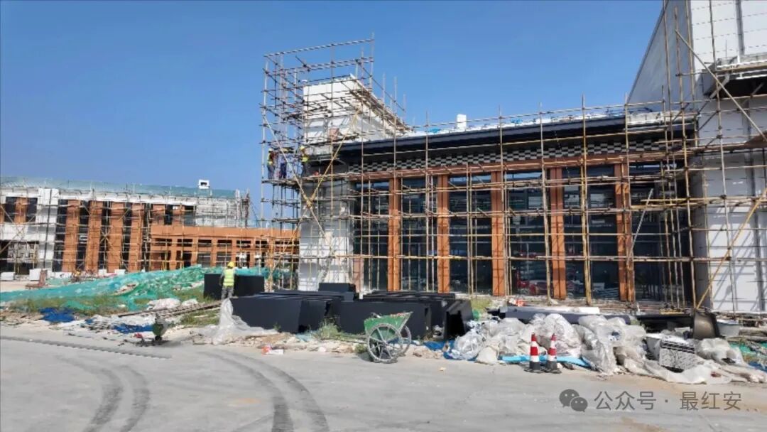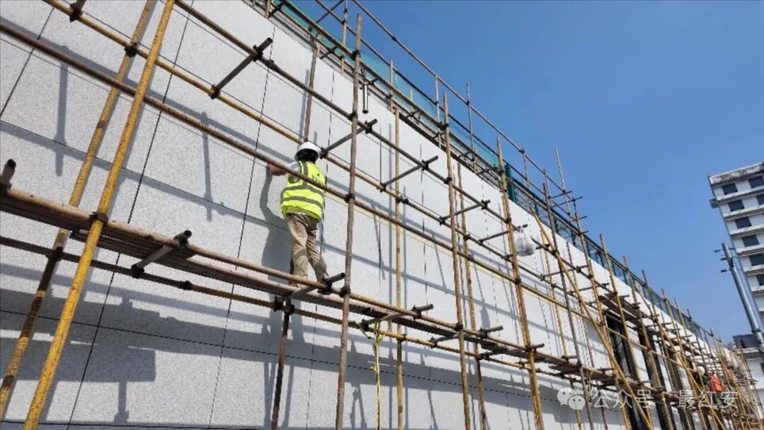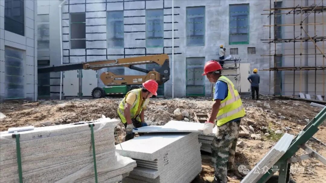 10月6日,正是万家团圆的中秋佳节。在七里坪革命文物保护利用设施项目施工现场,机器轰鸣与工人作业的声音交织,外立面施工架上,工人正专注地进行石材挂装;室内区域,地砖铺贴、石膏板安装等作业有序推进,每个人的脸上都透着专注与干劲。